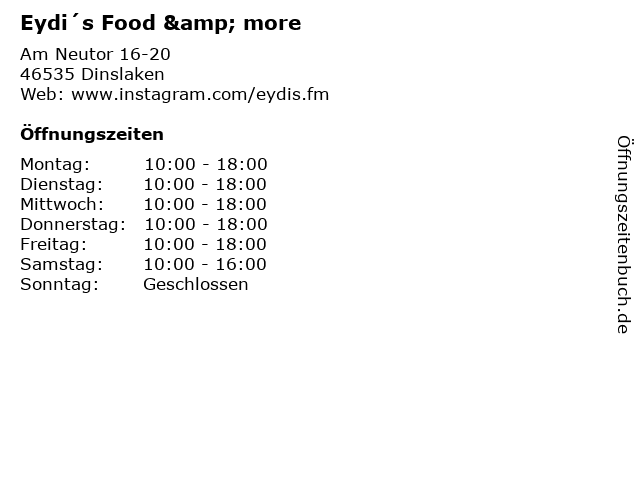 | Öffnungszeiten Eydi´s Food & more in Dinslaken anzeigen | |