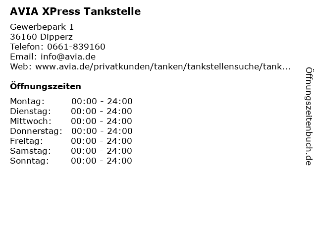 | Öffnungszeiten AVIA XPress Tankstelle in Dipperz anzeigen | |