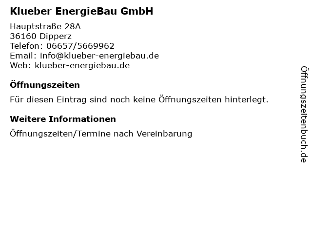 | Öffnungszeiten Klueber EnergieBau GmbH in Dipperz anzeigen | |
