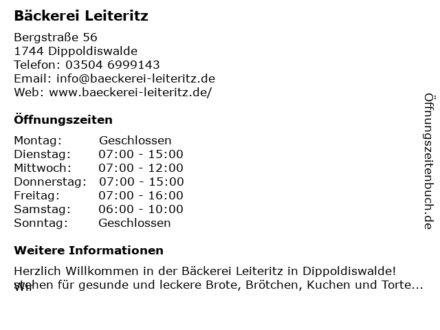 | Öffnungszeiten Bäckerei Leiteritz in Dippoldiswalde anzeigen | |