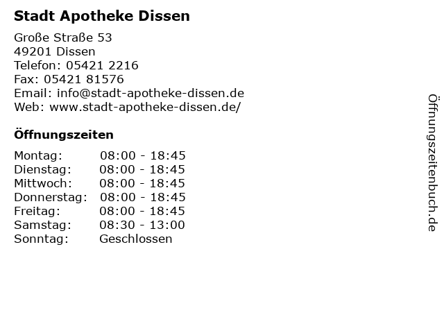 | Öffnungszeiten Stadt Apotheke Dissen in Dissen anzeigen | |