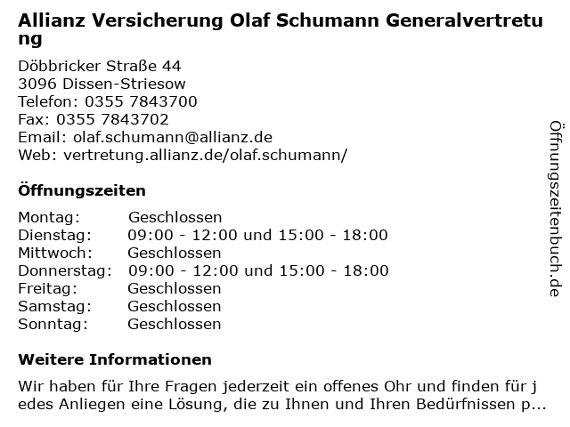 1 Allianz Versicherung Olaf Schumann Generalvertretung (Entfernung: 7,96 km) Rudolf-breitscheid-straße 1, 03046 Cottbus 3 Allianz Generalvertretung Wilhelm Söhlke Versicherung (Entfernung: 6,31 km) Gerhart-Hauptmann-Str. 15, 03044 Cottbus 4 Allianz Versicherung Lars Biechteler Generalvertretung (Entfernung: 7,59 km) Berliner Straße 68, 03046 Cottbus 5 Allianz Versicherung Diego Saleh Generalvertretung (Entfernung: 7,81 km) Ostrower Damm 20, 03046 Cottbus 6 Double Voices the best Entertainment und Tanzmusik Olaf Schäke (Entfernung: 8,08 km) Sachsendorfer Str. 23, 03046 Cottbus |