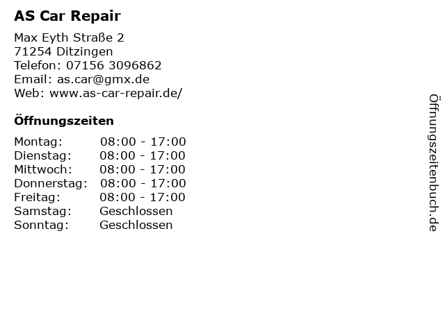 | Öffnungszeiten AS Car Repair in Ditzingen anzeigen | |