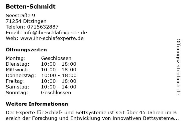 | Öffnungszeiten Betten-Schmidt in Ditzingen anzeigen | |