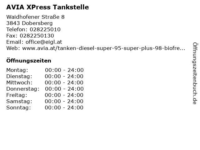 | Öffnungszeiten AVIA XPress Tankstelle in Dobersberg anzeigen | |