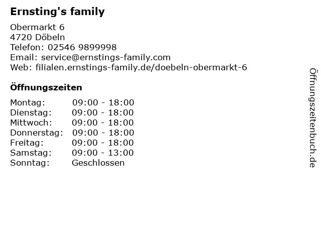 | Öffnungszeiten Ernsting's family in Döbeln anzeigen | |