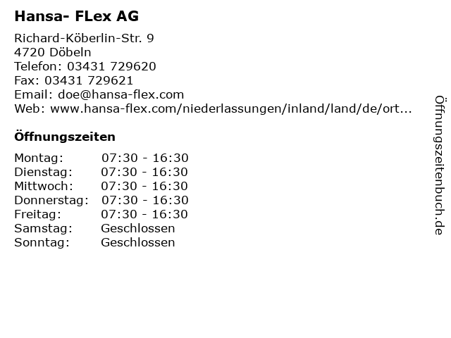 | Öffnungszeiten Hansa- FLex AG in Döbeln anzeigen | |