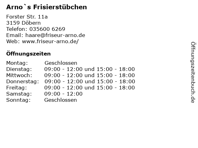 | Öffnungszeiten Arno`s Frisierstübchen in Döbern anzeigen | |