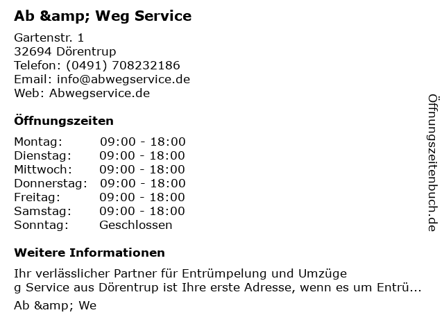 | Öffnungszeiten Ab & Weg Service in Dörentrup anzeigen | |