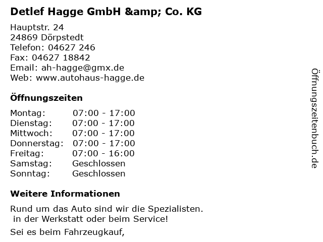 | Öffnungszeiten Detlef Hagge GmbH & Co. KG in Dörpstedt anzeigen | |