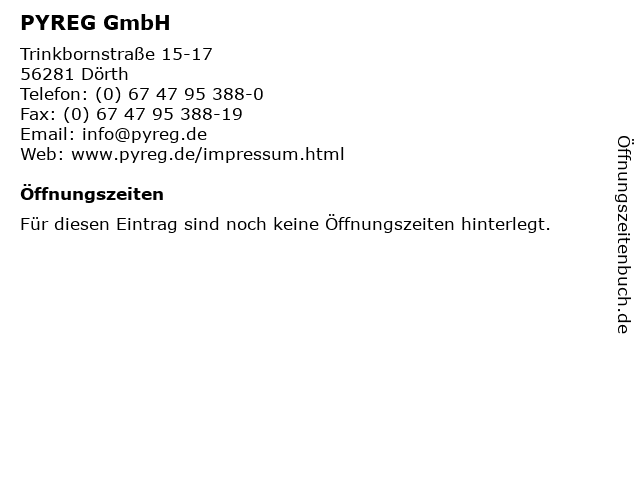 | Öffnungszeiten PYREG GmbH in Dörth anzeigen | |