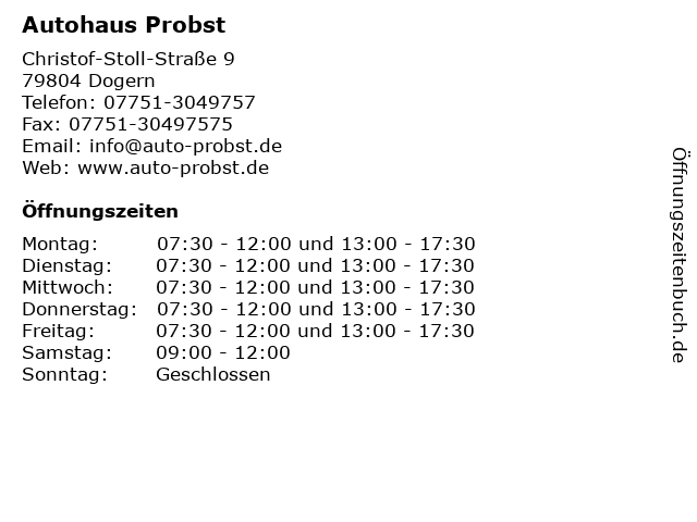| Öffnungszeiten Autohaus Probst in Dogern anzeigen | |