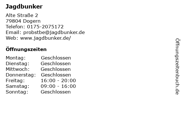 | Öffnungszeiten Jagdbunker in Dogern anzeigen | |