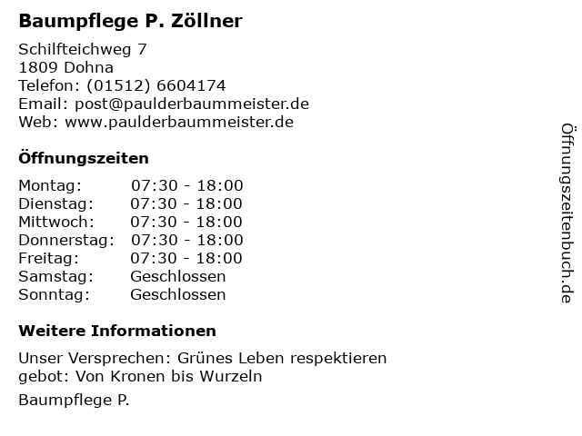 | Öffnungszeiten Baumpflege P. Zöllner in Dohna anzeigen | |