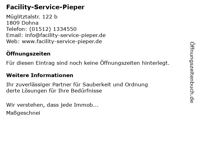 | Öffnungszeiten Facility-Service-Pieper in Dohna anzeigen | |