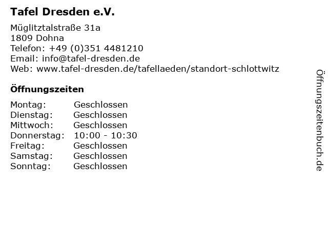 | Öffnungszeiten Tafel Dresden e.V. in Dohna anzeigen | |