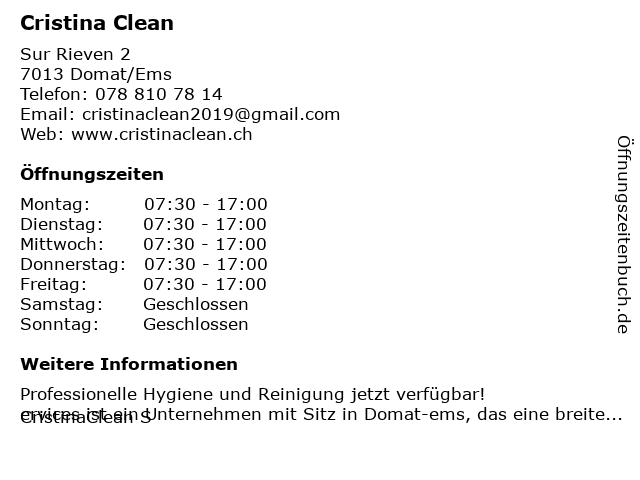 | Öffnungszeiten Cristina Clean in Domat/Ems anzeigen | |