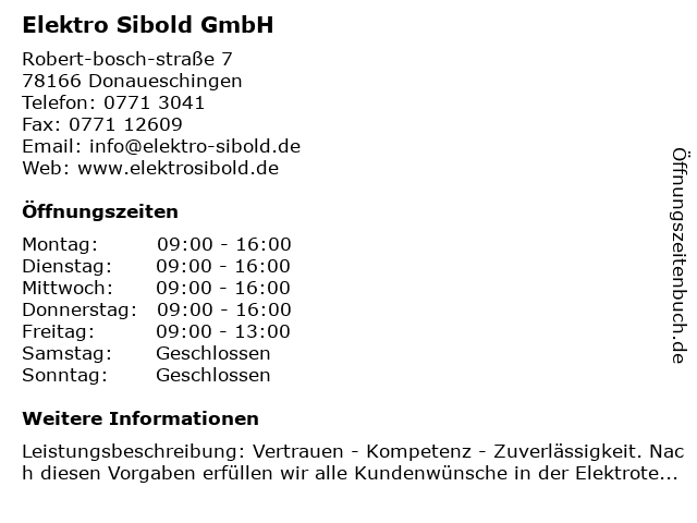 | Öffnungszeiten Elektro Sibold GmbH in Donaueschingen anzeigen | |