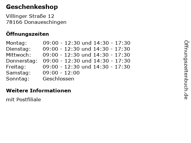 | Öffnungszeiten Geschenkeshop in Donaueschingen anzeigen | |