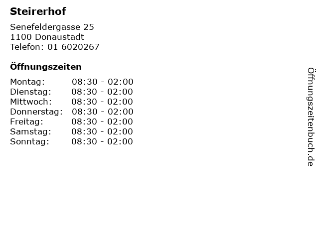| Öffnungszeiten Steirerhof in Donaustadt anzeigen | |