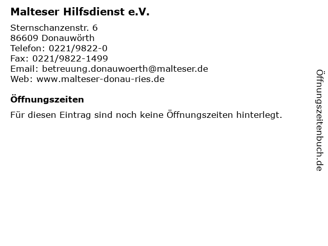 | Öffnungszeiten Malteser Hilfsdienst e.V. in Donauwörth anzeigen | |