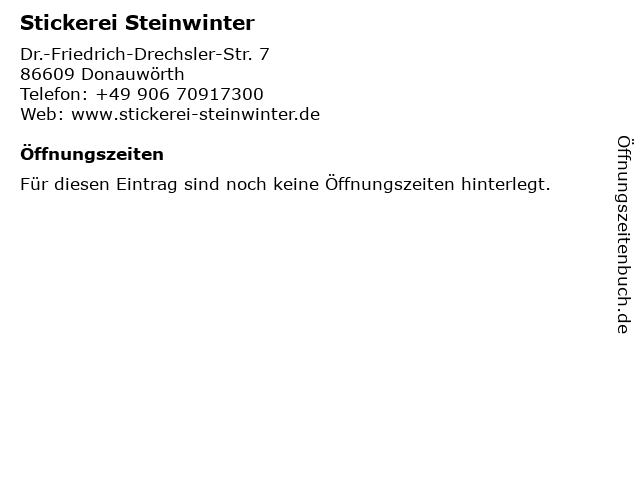 | Öffnungszeiten Stickerei Steinwinter in Donauwörth anzeigen | |