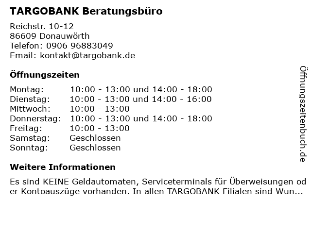 | Öffnungszeiten TARGOBANK Beratungsbüro in Donauwörth anzeigen | |
