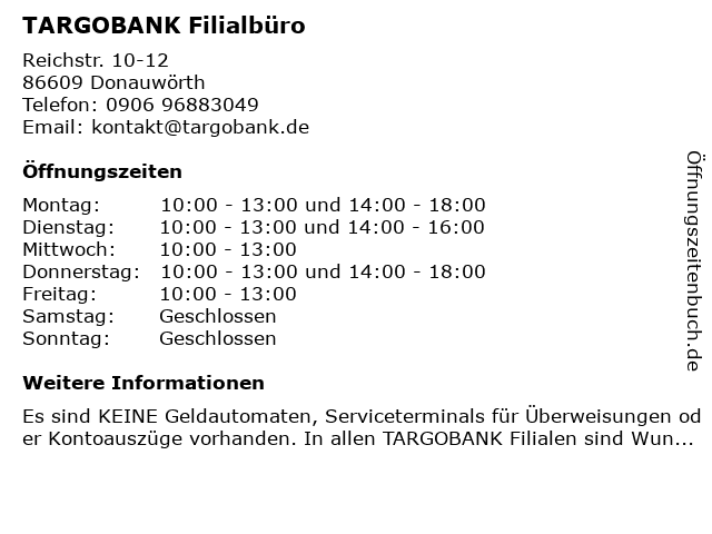 | Öffnungszeiten TARGOBANK Filialbüro in Donauwörth anzeigen | |