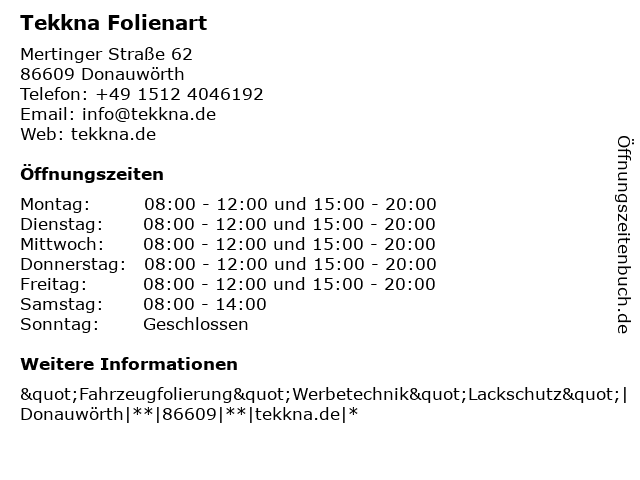 | Öffnungszeiten Tekkna Folienart in Donauwörth anzeigen | |