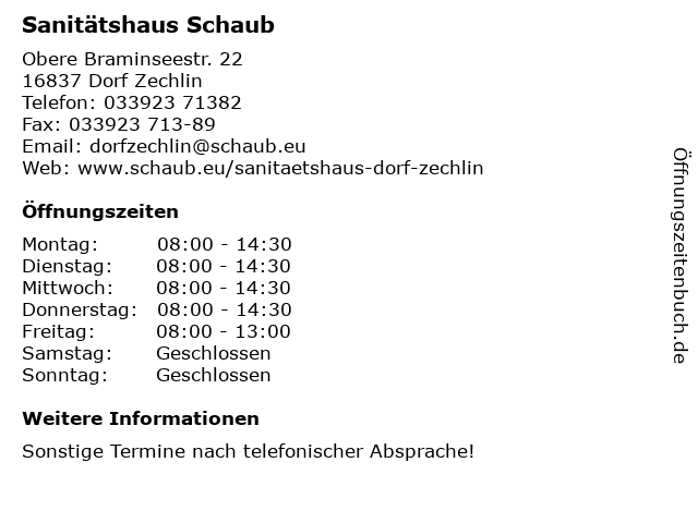 | Öffnungszeiten Sanitätshaus Schaub in Dorf Zechlin anzeigen | |