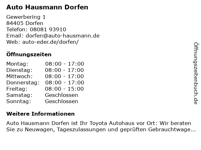 | Öffnungszeiten Auto Hausmann Dorfen in Dorfen anzeigen | |