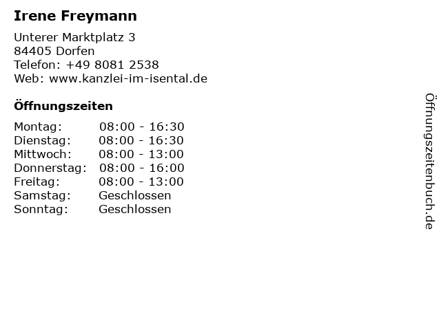 | Öffnungszeiten Irene Freymann in Dorfen anzeigen | |