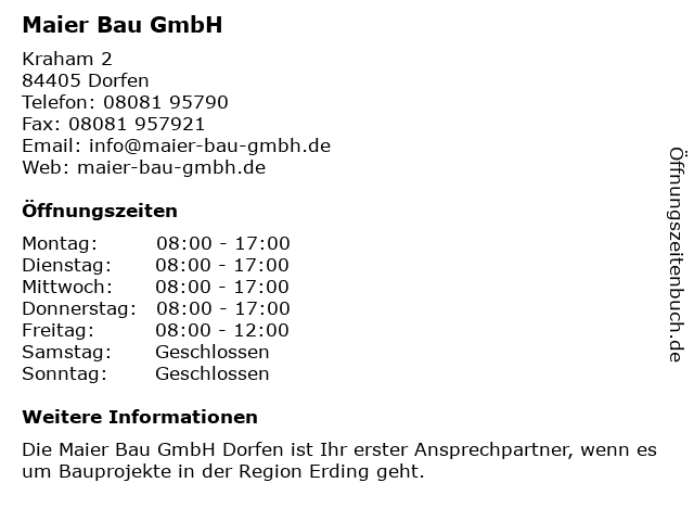 | Öffnungszeiten Maier Bau GmbH in Dorfen anzeigen | |