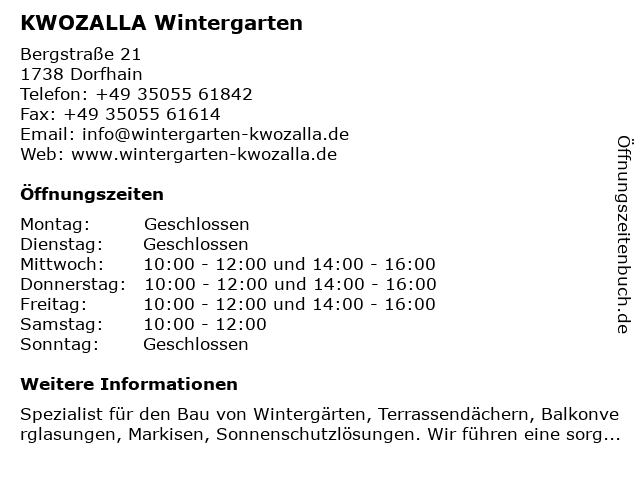 | Öffnungszeiten KWOZALLA Wintergarten in Dorfhain anzeigen | |