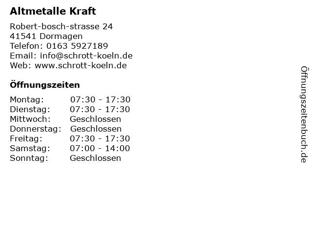 | Öffnungszeiten Altmetalle Kraft in Dormagen anzeigen | |