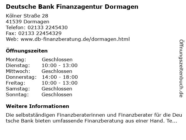 Branchen & Suchbegriffe zu Deutsche Bank Finanzagentur Dormagen:bank, deutsche, finanzagentur |