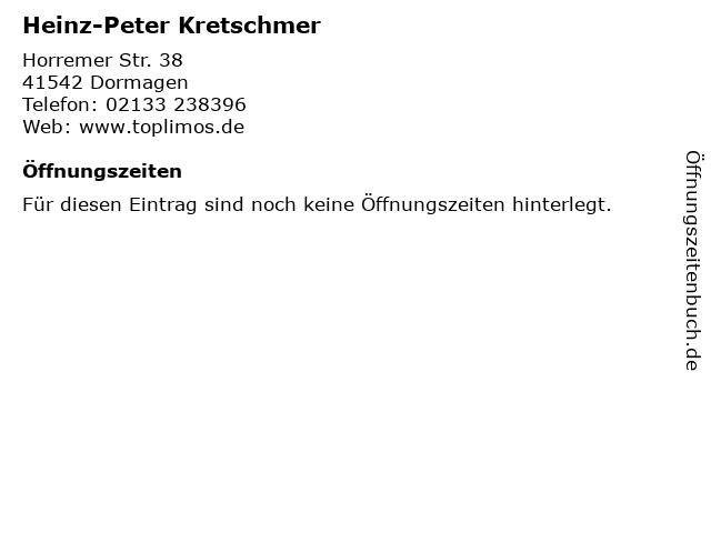 | Öffnungszeiten Heinz-Peter Kretschmer in Dormagen anzeigen | |