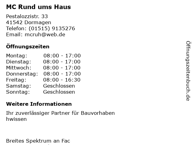 | Öffnungszeiten MC Rund ums Haus in Dormagen anzeigen | |