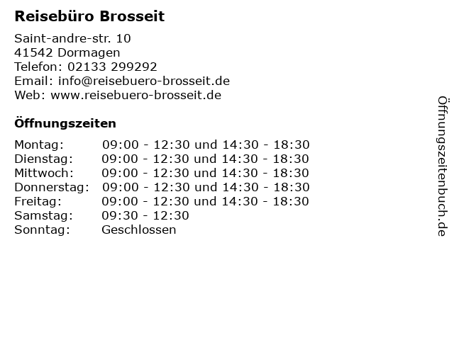 | Öffnungszeiten Reisebüro Brosseit in Dormagen anzeigen | |