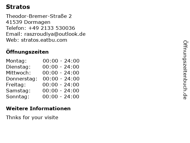 | Öffnungszeiten Stratos in Dormagen anzeigen | |