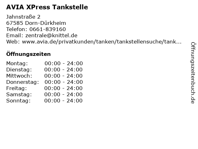 | Öffnungszeiten AVIA XPress Tankstelle in Dorn-Dürkheim anzeigen | |