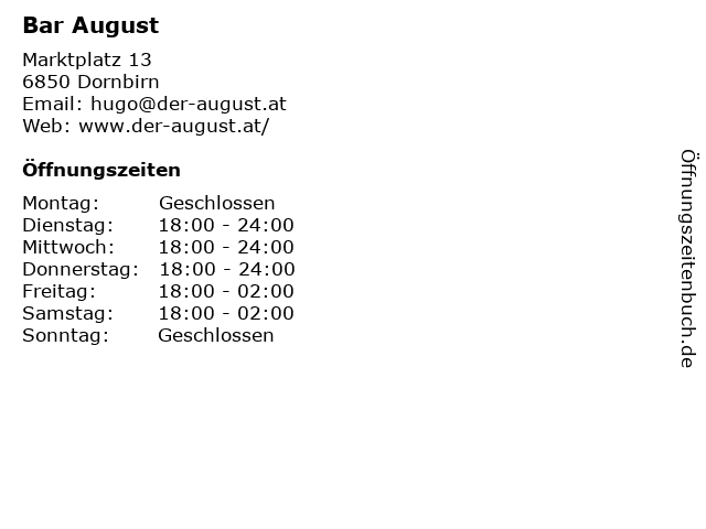 | Öffnungszeiten Bar August in Dornbirn anzeigen | |