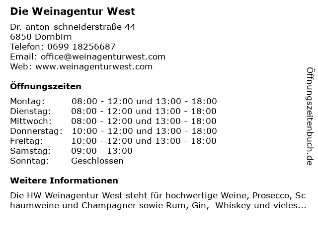 | Öffnungszeiten Die Weinagentur West in Dornbirn anzeigen | |