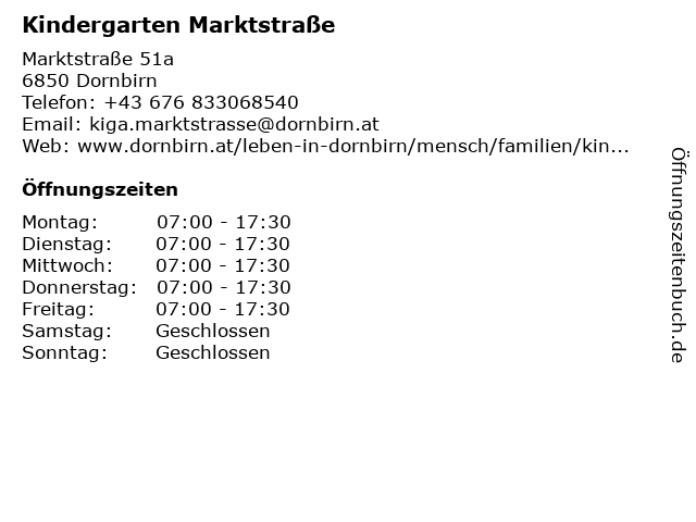 | Öffnungszeiten Kindergarten Marktstraße in Dornbirn anzeigen | |