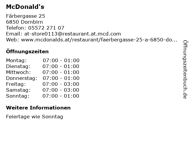 | Öffnungszeiten McDonald's in Dornbirn anzeigen | |