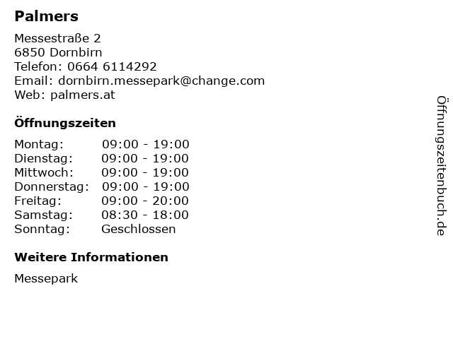 | Öffnungszeiten Palmers in Dornbirn anzeigen | |