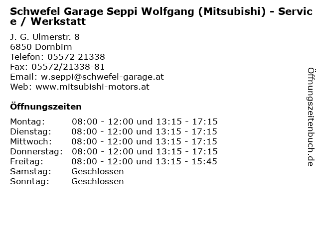 4 SULFUR Garage Seppi Wolfgang (Service / Workshop) (Entfernung: 1,63 km) JG Ulmerstr. 8, 6850 Dornbirn 6 |