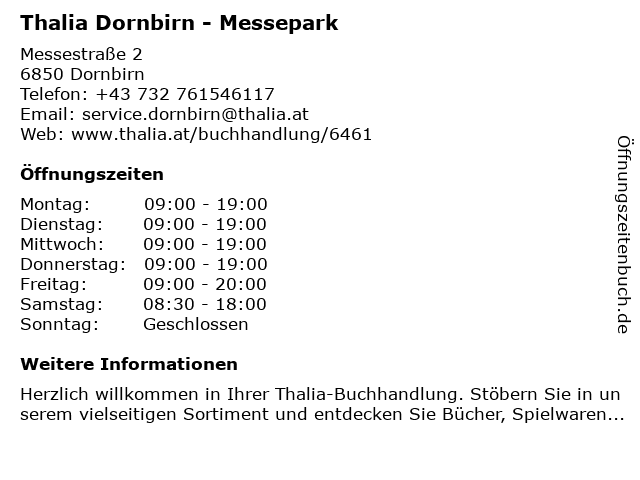1 Triumph Lingerie - Einkaufszentrum Messepark Dornbirn (Entfernung: 0,01 km) Messestraße 2, 6854 Dornbirn 4 Hypo Vorarlberg Bank AG - Filiale Dornbirn Messepark (Entfernung: 0,06 km) Messestraße 2, 6850 Dornbirn 6 |