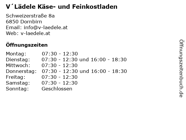 | Öffnungszeiten V´Lädele Käse- und Feinkostladen in Dornbirn anzeigen | |