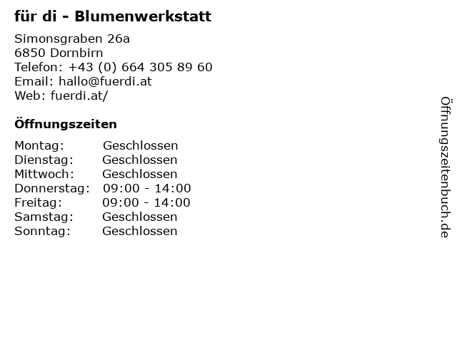 | Öffnungszeiten für di - Blumenwerkstatt in Dornbirn anzeigen | |